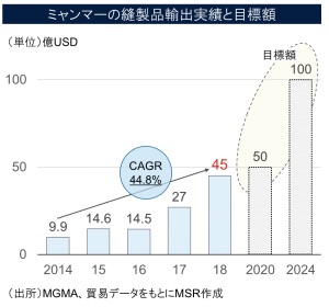 近年ミャンマーの縫製品輸出が活発だ。2018年は前年から2倍近く伸び、45億USD(図1)とミャンマーの業界団体が目標としていた「2020年までに50億USDの輸出」を2019年には前倒しで達成することが所期される。EUがミャンマー産縫製品の最大市場との認知は正しいが、単一国でみれば日本が最大の輸出先だ。